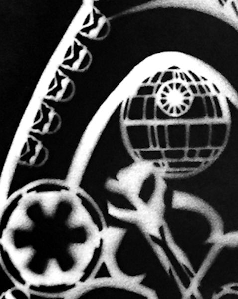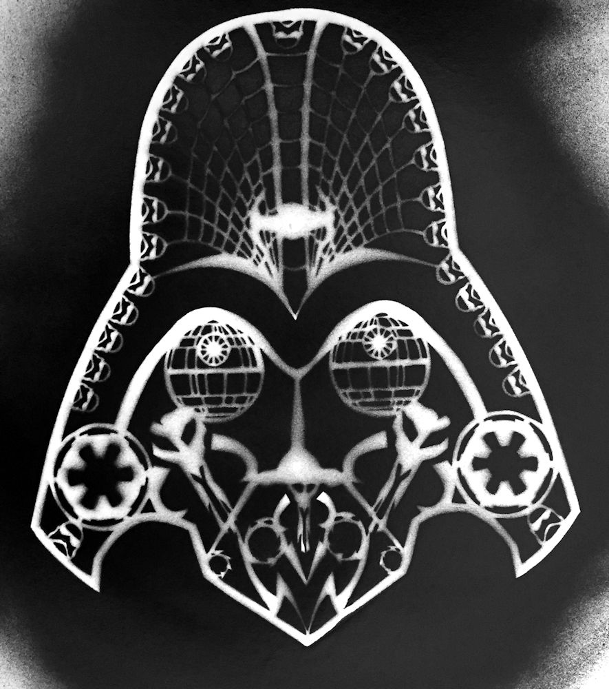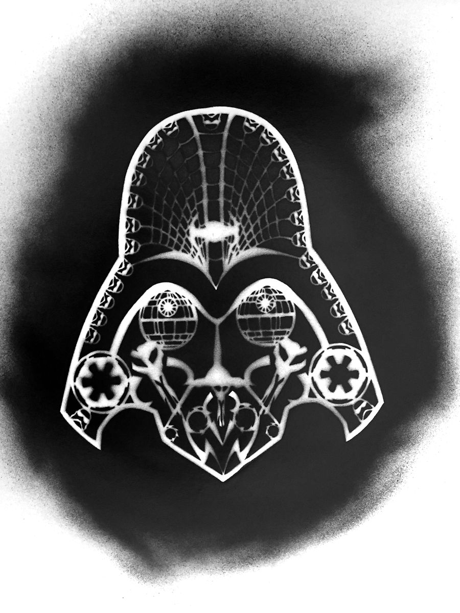 The overspray companion to ‘Death Vader’ original (see HERE), this equally unique overspray combines the unmistakeable shape of Darth Vader’s mask with a ‘Day of the Dead’ sugar mask.