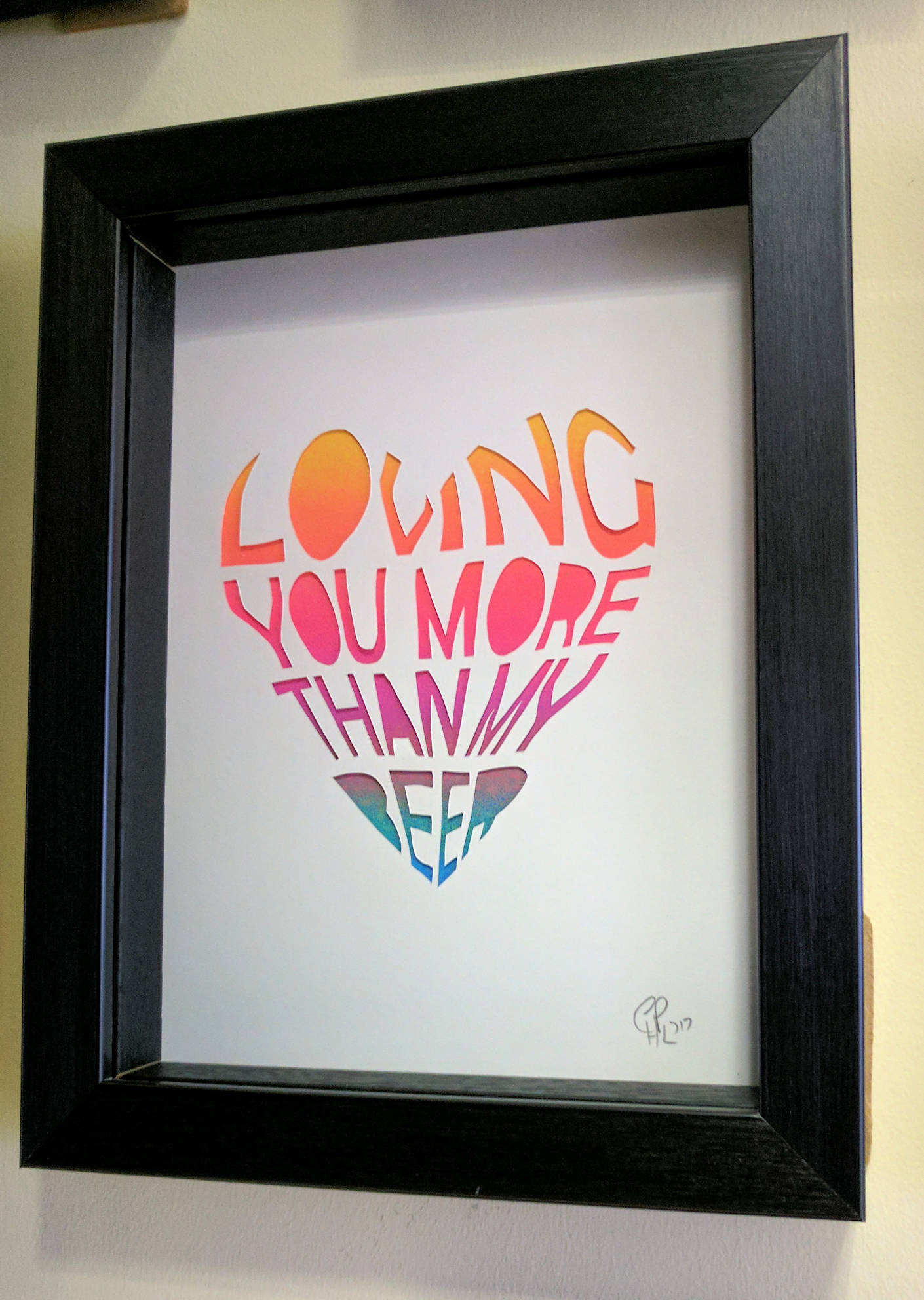 A hand-cut, papercut which reads “I love you more than beer”.