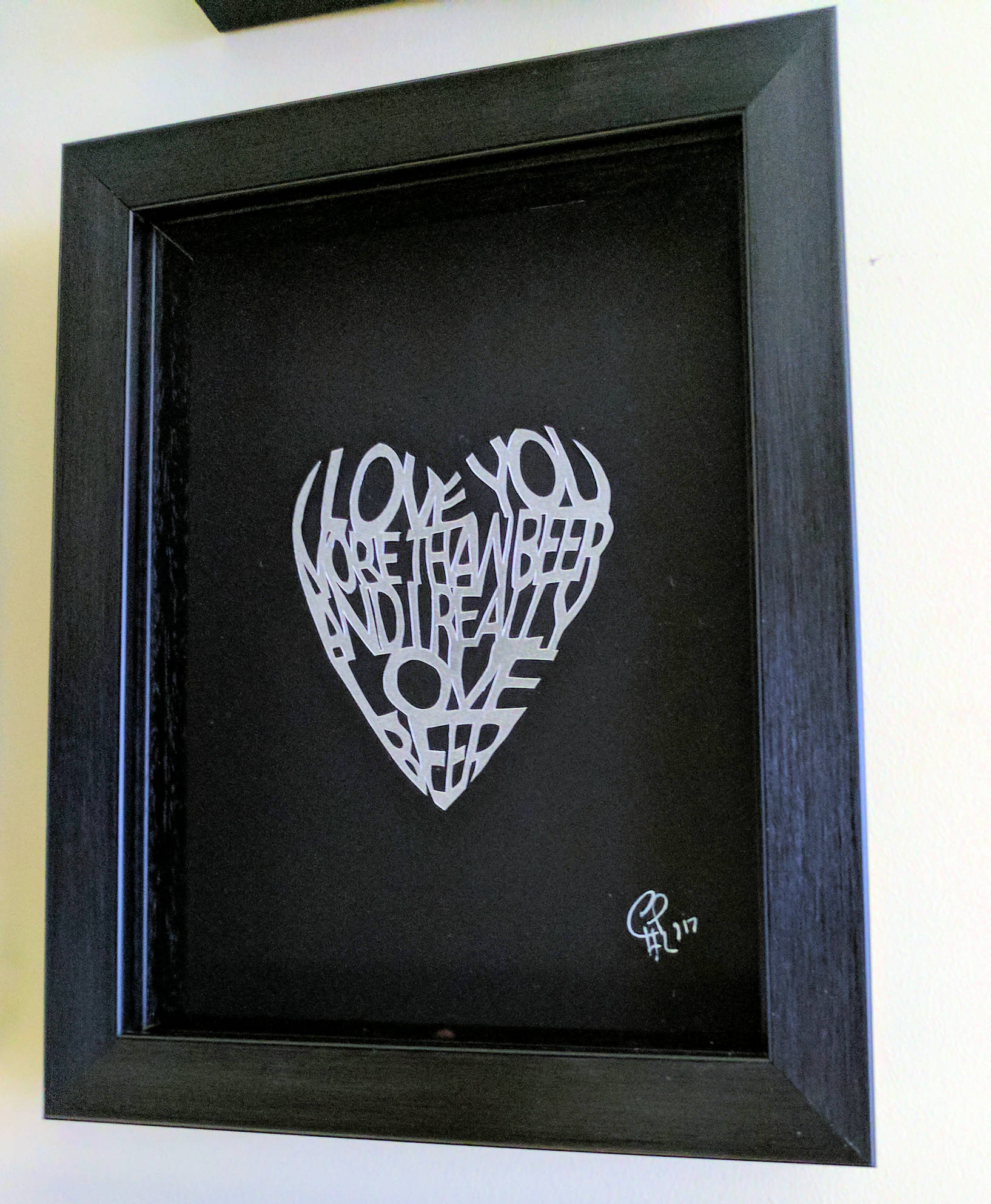 A hand-cut, papercut which reads “I love you more than beer, and I really love beer”.