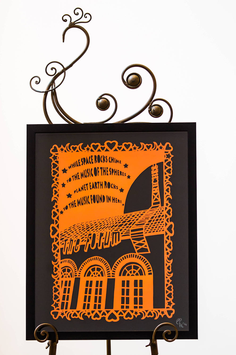 Signed by the artists, ‘Music is life’ is a one-off, hand-cut, fluorescent orange papercut mounted on blakc archive quality mountboard complete with a solid wood box frame.