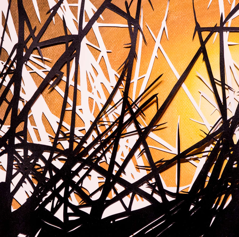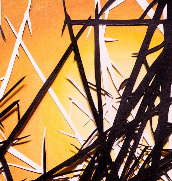 This original hand cut design features tangled grasses and thorns, and is currently the only layered designs in our collections. The two intricate papercuts, one black and one white, have been layered together and back mounted onto an original pastel painting of one of our striking sunburst designs.